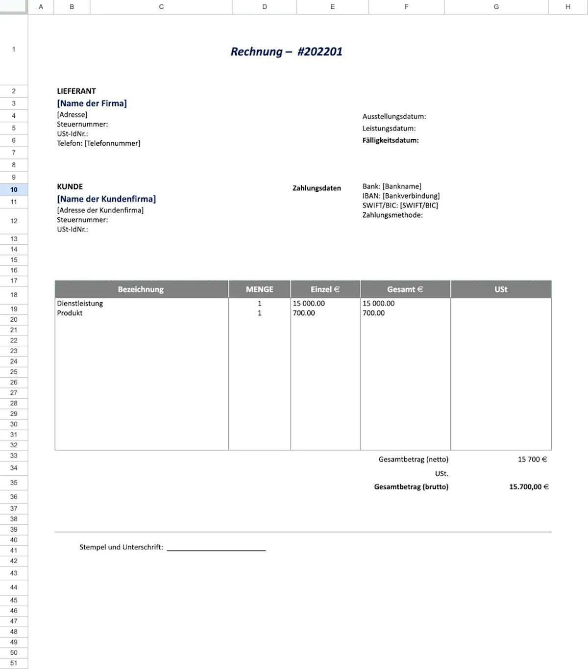 Egal, ob Sie Ihre Rechnung in Excel oder einem anderen Tool erstellen – sie muss die gesetzlich vorgeschriebenen Pflichtangaben gemäß § 14 UStG enthalten. Fehlt eine davon, kann der Empfänger den Beleg beanstanden, und Sie riskieren Probleme bei einer Betriebsprüfung.
