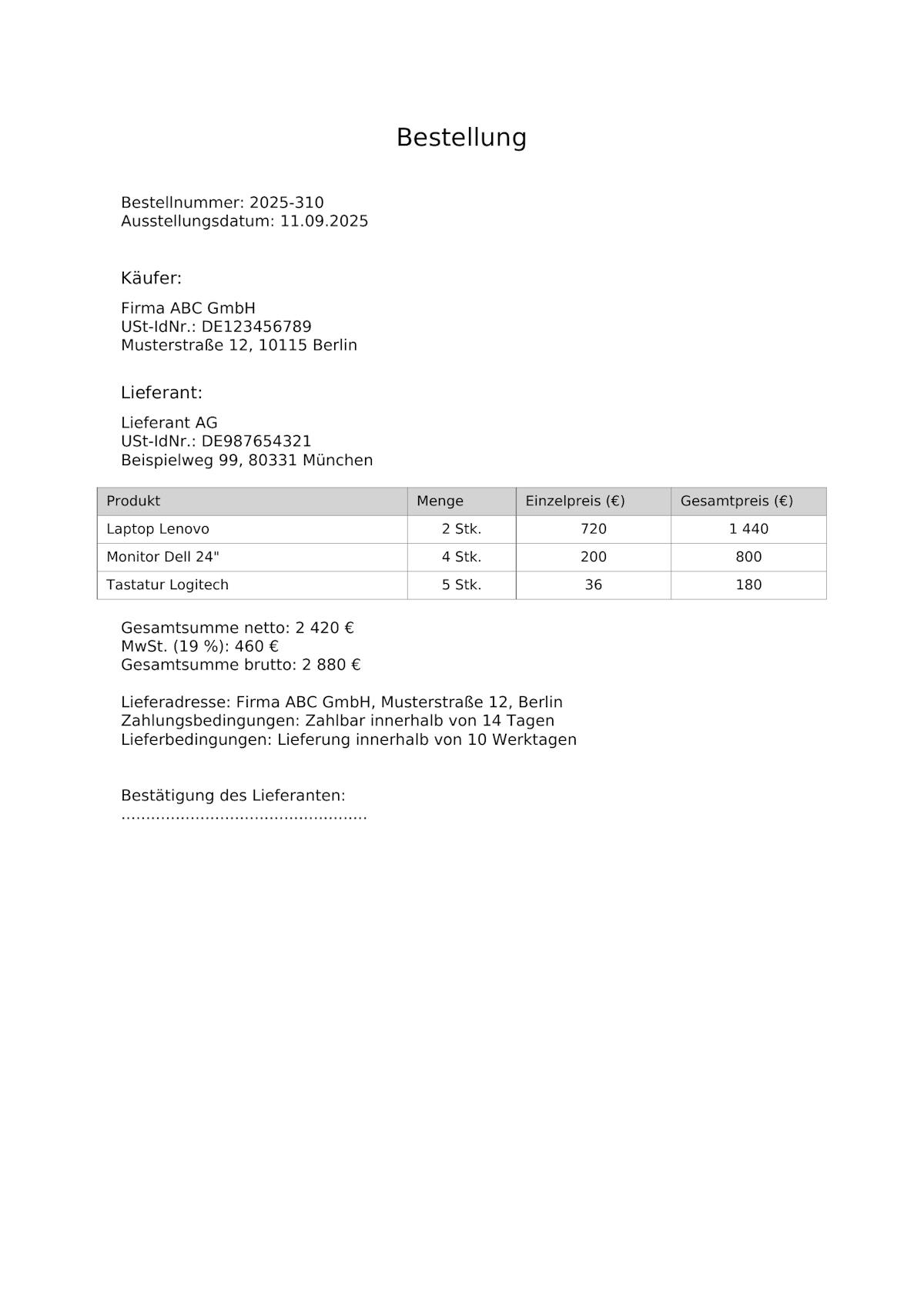 Eine Bestellung ist ein formelles Dokument, das von einem Käufer an einen Lieferanten gesendet wird, um Waren oder Dienstleistungen verbindlich zu ordern. Nach Annahme durch den Lieferanten wird die Bestellung rechtlich bindend und bildet die Grundlage für die spätere Rechnung und Lieferung.